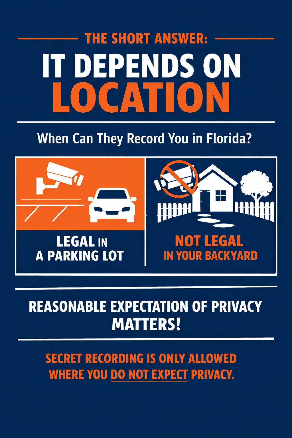Insurance companies and the private investigators they hire are permitted to record you in Florida, but only under certain conditions. The key legal concept is the “reasonable expectation of privacy.” Under Florida Statute § 810.145, it is unlawful to use an imaging device to secretly observe or record a person in a place where that person reasonably expects to be in private. In plain terms, what is legal in a parking lot is not legal in your backyard.
